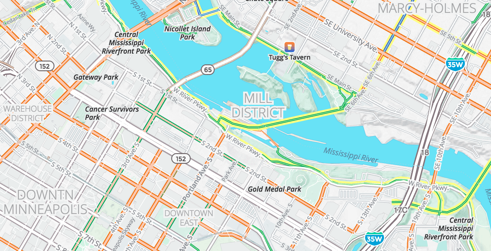 Also, it turns out that people have… opinions about map colors. Our choices are admittedly qualitative, but we wanted a “warm” set of colors that would let cyclists readily see safer routes and would work well with the Walkabout palette.