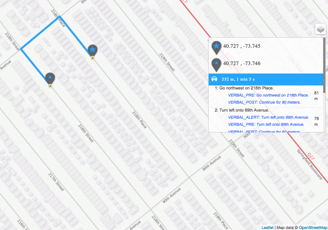 One practical example is SIF costing for driving routes (auto) which penalizes left hand turns more than right hand turns by default. (In countries where driving occurs on the left hand side of the road the opposite occurs.) The simple example below shows a case where a longer path is taken so that costly left turns are avoided. In this case, two right hand turns are made and while the route is over twice as long, they are roughly equivalent in time.