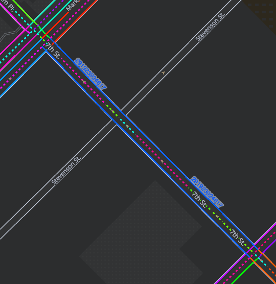 In the above example, one OSMLR segment is drawn in double blue strokes along 7th St. in San Francisco. The OSMLR segment has an ID number of 291923924617. The dotted centerlines indicate OSM ways, with a different color for each OSM way. Note how the OSMLR segment represents the entire stretch of 7th St. between Market St. and Mission St. It joins together multiple OSM ways, which were created in order to provide finer detail for bicycle lane tagging. Those differences are not relevant to OSMLR and its use for Open Traffic. Open this area on OpenStreetMap.org to explore these OSM ways.